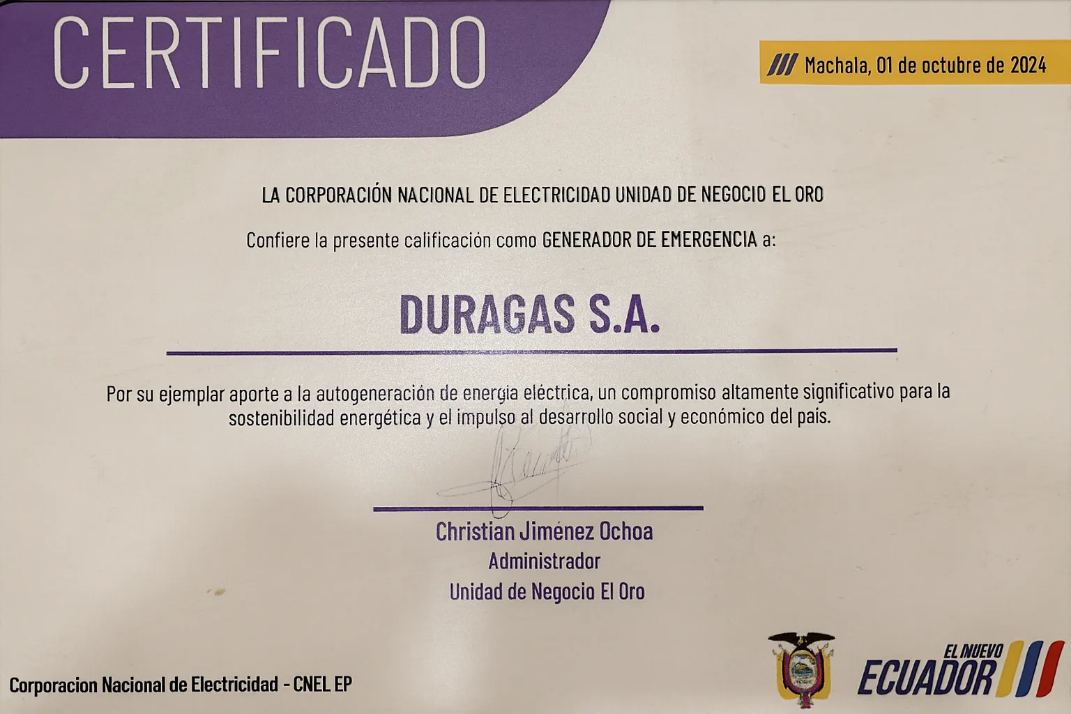 Hemos sido reconocidos por el ejemplar aporte de nuestra planta ubicada en Santa Rosa, provincia de El Oro, al sistema energético nacional a través de la autogeneración de energía eléctrica.